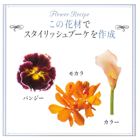 ■花材:モカラ、カラー、パンジー、白い実物。参考価格:\35,000