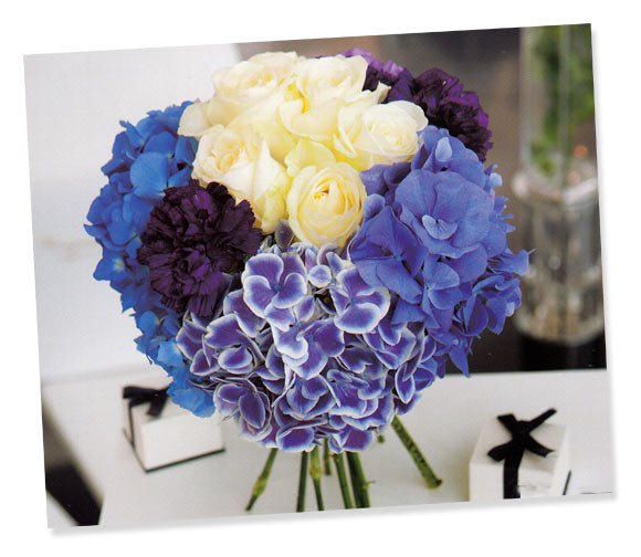 色鮮やかなシンプルなものと白い縁取りのある2つの青いアジサイに、ベルベットを思わせるようなノーブルなカーネーションをミックスしたラウンドブーケ。純白のバラが清楚で知的な雰囲気をプラス。柔かな花弁の質感が、瑞々しさと優しさを醸し出している。