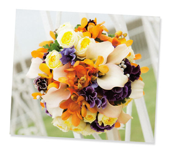 オリエンタルな雰囲気を放つモカラのビビッドなオレンジと、パンジーの気品溢れる紫のコントラストが斬新。その間にバランスよく配したカラーの凛とした表情を活かしたラウンドブーケは、細長くたなびくオレンジのリボンで、大人っぽく仕上げて。