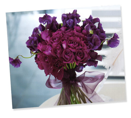 気高く咲き誇るボルドーなバラと、優しいフリルが舞う紫色のスイトピーを贅沢に束ねた、モード感溢れるクラッチブーケ。あえて2つのパートに分けることで、それぞれの鮮やかな色のインパクトを強調。シンプルな透け感のある紫のリボンもスタイリッシュ。