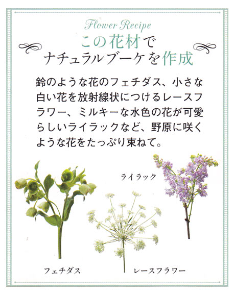 ■花材:ライラック、ヒヤシンス、フェチダス、レースフラワー、ユーカリ。参考価格:\35,000