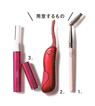 ストレートアイロンを使うと髪にコシやツヤが出るのと同じように眉毛にもホットカーラーを使うとコシがアップ。2を眉頭は上向きに、それ以外は毛流れに沿って使うのがポイント。