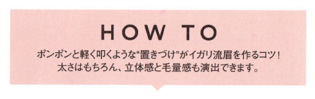 3を毛流れに逆らうように目尻から眉頭に向かってつけると毛の裏側も染まるので、自然な色づきに。眉頭がキレイなスクエアになるように眉頭の毛は上向きに立たせるのがポイント。