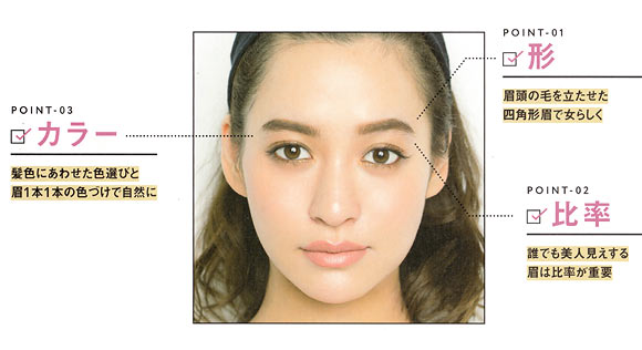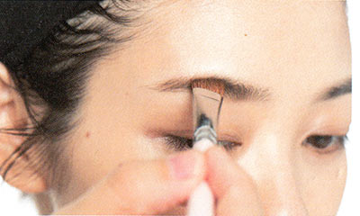 高さをあわせ、小鼻のつけ根の延長線上から眉が始まり、眉山は黒目の外側から目尻の間、口角から目尻の延長線上が眉毛の終着点になるように作る。これが美人に見える眉の比率。