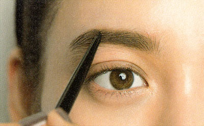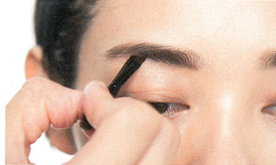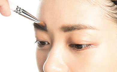 眉頭の毛は上向きに立たせ、眉頭がキレイなスクエアになるようにすると品のいい仕上がりに。また、眉頭にのせるパウダーは薄めにして毛を目立たせるともともとの素材のよさが際立つ。
