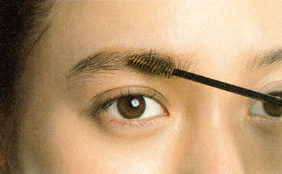 赤みのあるブラウンカラーの眉マスカラを使用。スクリューが眉と平行になるようにし、眉にやさしくバウンスさせてつけると立たせた毛が潰れず、キレイなコシのある仕上がりに。
