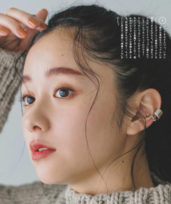 今季トレンドのクラシックな雰囲気にハマるゴールドのアクセ。基本のスタイルがシンプルだから、すんなり取り入れられるんです。寒さで血色が悪くなりがちな時期、顔まわりに添えると表情が明るくなる効果も。