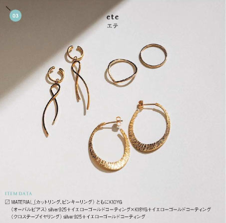クラシックな雰囲気にハマる華奢なアクセサリーが豊富な「ete」。なかでも愛らしくも大人の気品を感じさせるゴールドが人気。基本のスタイルがシンプルなので、手元耳元での重ねづけだって、すんなり取り入れやすいんです。