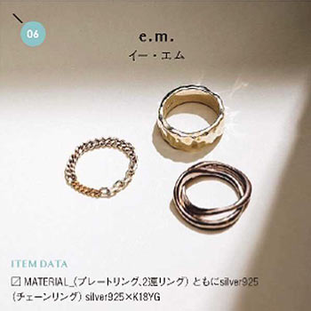 (上から時計回り)シンプルリング(たたき加工)12,000円+税、2連リング16,000円+税、チェーンリング14,000円+税 / 以上e.m.(e.m.表参道店)