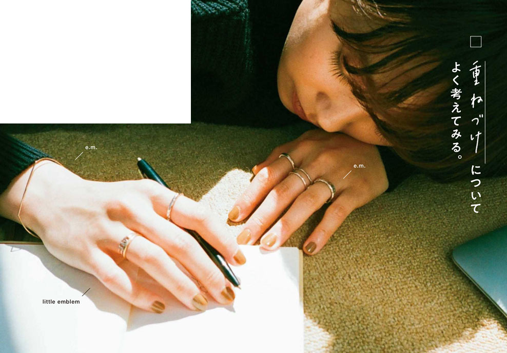 同じブランドのリングを連ねると、自然と統一感が生まれる。