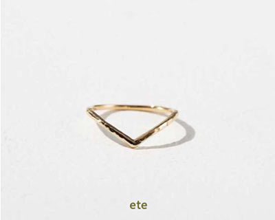 クラフト感のある、ちょっと凸凹した表面感が、今っぽい雰囲気を持つデザインのポイント。Vカットのピンキーリングは指をすらりと見せてくれ、関節にとめるファランジリングとして使うのも◎。