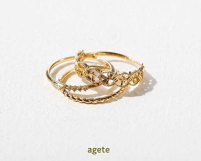 アガットから、クリスマス限定のリングセットが登場。透かし模様や、細かく入れたミルグレイン技法による装飾など、それぞれが肌になじむデザインで、セットづけはもちろん、手持ちのリングに重ねてもキマる。