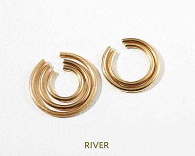 サイズの異なる5つのイヤーカフのセット。ひとつずつバラして耳元をジャラジャラ飾るのもよし。大きいものの内側に小さいものをはめ込み、太いイヤーカフにするのもあり! 好きなようにアレンジを効かせて。