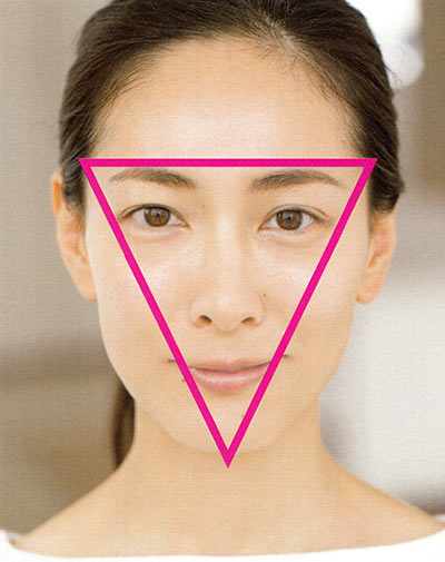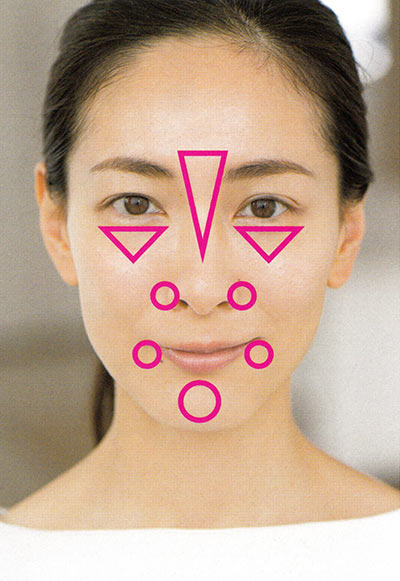 人は顔の中心を見るので、この部分の肌が整っていれば“きれいな肌の人”という印象を与えられます。上の写真の逆三角形部分をしっかり丁寧に塗りましょう。残りの部分は、指や手に残ったファンデーションを、てのひら全体にのばしてざっと塗ります。