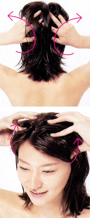 下 / 側頭部を洗うときは、目がつり上がるくらい頭皮を引き上げ。シャンプーのついでにマッサージを取り入れて血行促進。