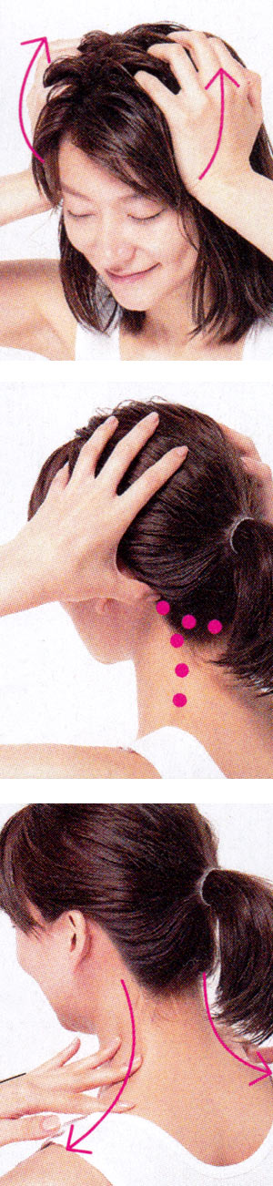 中と下 / 左耳の後ろ、うなじ、首筋を指圧した後、鎖骨へとさすり流して循環を促す。