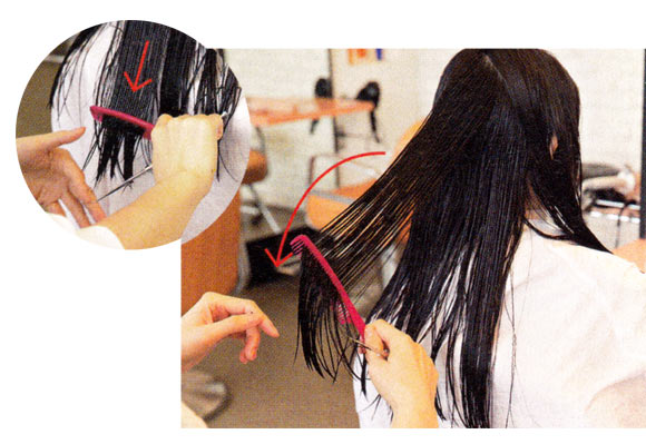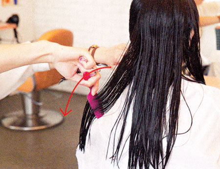 【1】普通なら左上の写真のように切るところ、Rカットではタテに毛束をとって斜めに切る。