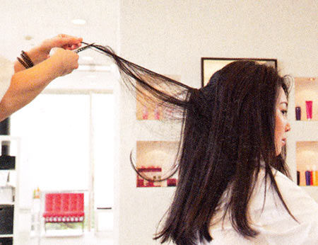 くせ毛で悩む人に人気のサロン、「ディフィーノ」。オリジナルの「Rカット」で切ると、広がるくせの収まりがよくなるのだそう。「髪たるませた状態で切るんです。自然な毛流れを想定して切るので、収まるのはもちろん、女らしい丸みも出るんですよ」(山岡さん)。「毎朝乾かすだけですぐ決まるし、カットが長もちするのも驚きです!」(合田さん)