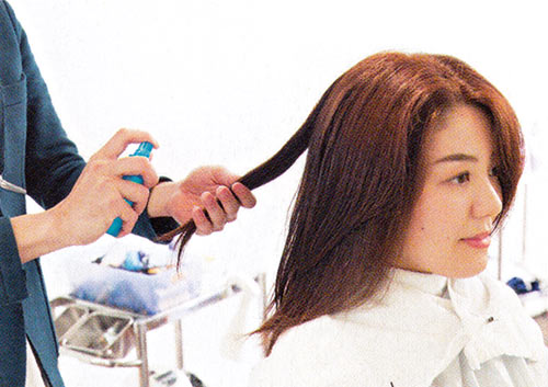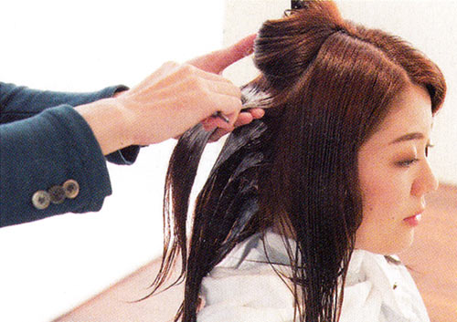 【1】髪質に合わせ、トリートメント剤をつける。清水さんは髪をやわらかくするタイプを。