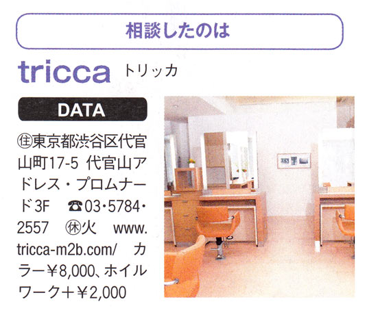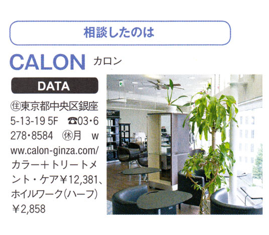 透明感にこだわり、基本的に白髪染め剤を使わない「カロン」。「おしゃれ染めの暗い色を使い、時間をおくので白髪も染まるんです」と西海さん。ベースは低アルカリのカラー剤にトリートメントを混ぜて使うため、白髪カバーと同時にツヤとやわらかさが加わり、上等な髪質になるのを実感。白髪と長くつきあっていくための、ケア面の配慮がうれしい。