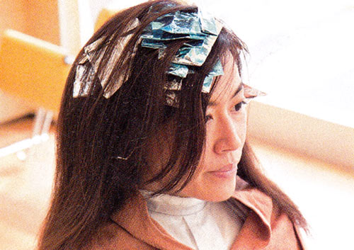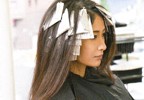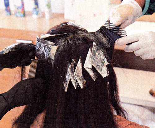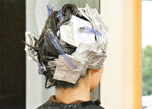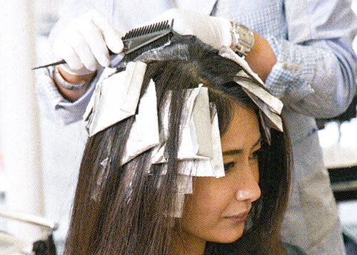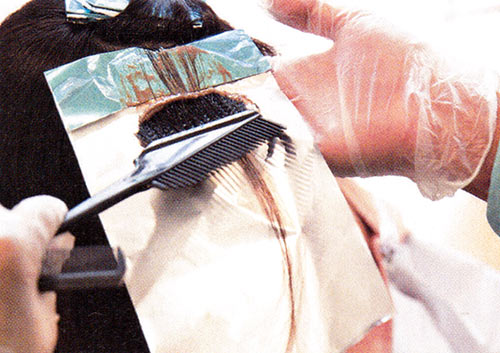 【1】白髪のある部分はローライト(暗い筋)を入れる。白髪染めの入った薬剤を筋状に塗る。