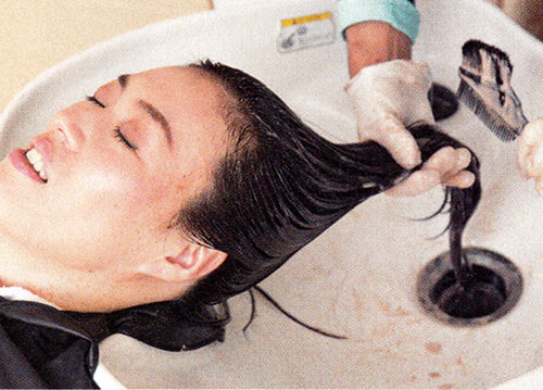 【4】最後にカラーコート剤を兼ねたシャンプーで洗い流し、全体のトーンをなじませる。