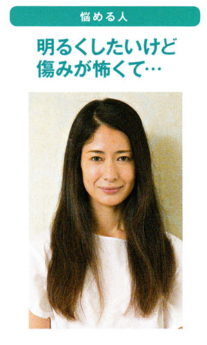 白髪はごくたま~に見つかる程度で、深刻ではないけれど、傷みがなければ明るめのカラーに印象を変えたい。髪質は、細めでくせ毛。