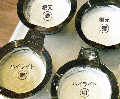 【1】ハイライトの明るめと暗め、全体の根元用の濃淡4色のカラーを用意する。