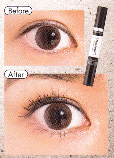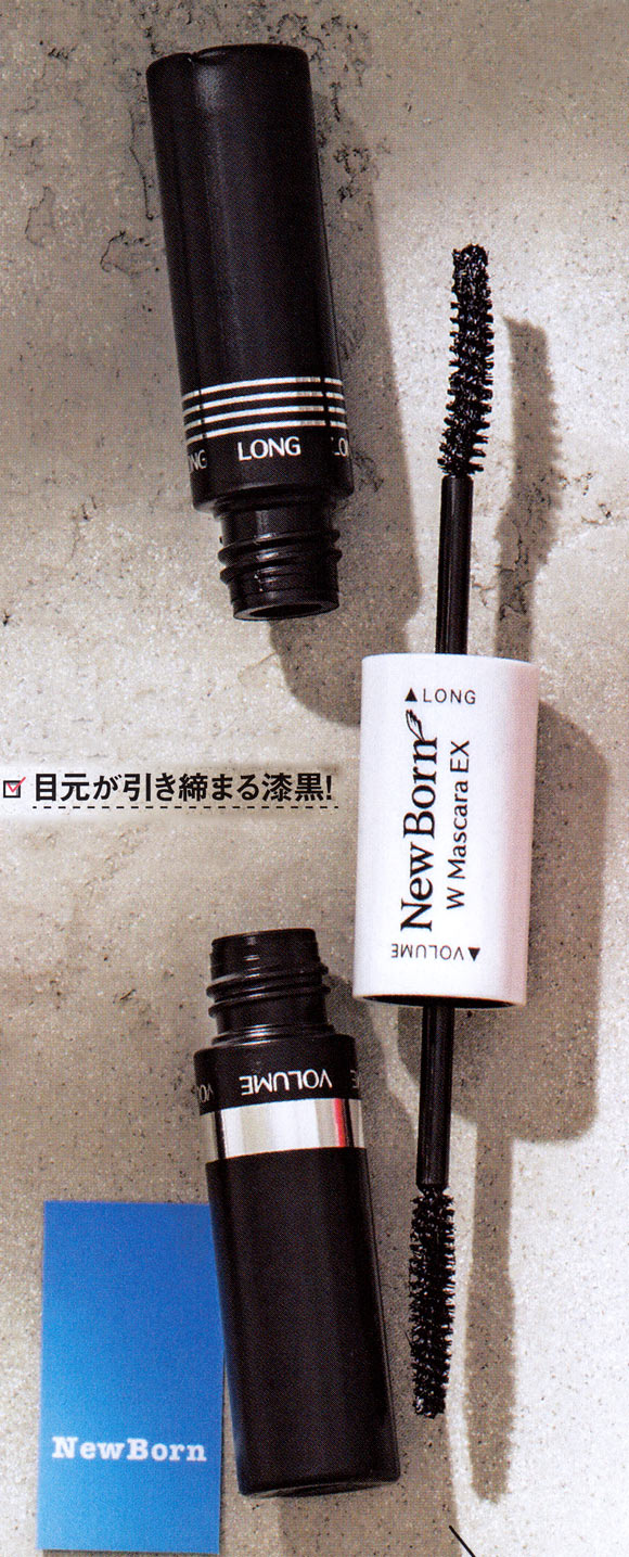 下地のカールキープ効果も併せ持ち、細いまつ毛も太くするボリュームタイプと、セパレート効果に優れダマなく伸ばすロングタイプのW機能。ボリューム→ロングで重ねると黒々とインパクトのある目元に。汗・水に強いお湯落ちフィルムタイプ。