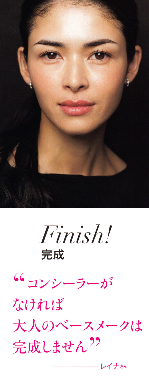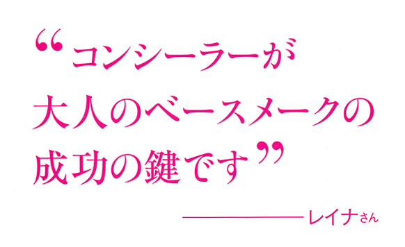 若い女性の間では、カバー力のあるファンデーションを顔全体にしっかり塗るのがトレンドですが、大人の女性は同じ塗り方をすると、首の肌と差が出てしまい老けた印象に。レイナさんは「コンシーラーと肌色補正効果のある下地があれば、充分に自然できれいな肌に仕上がります。