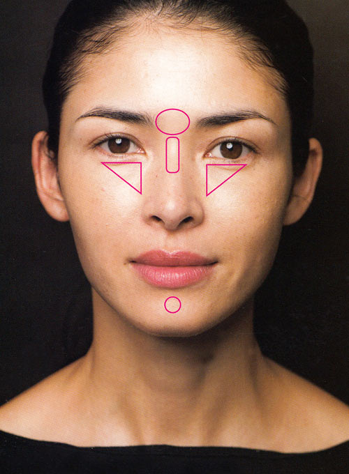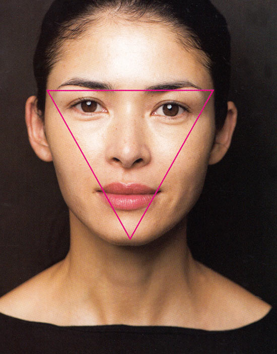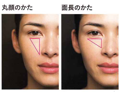 目の下(三角形)に、丸顔のかたは縦長にし、面長のかたは横長に入れると、顔型の補正効果につながります。
