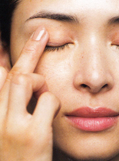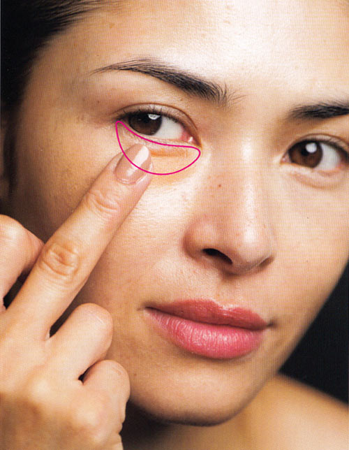 2で指に残ったコンシーラーを、くすみがちなまぶたにも。軽くトントンとなじませます。