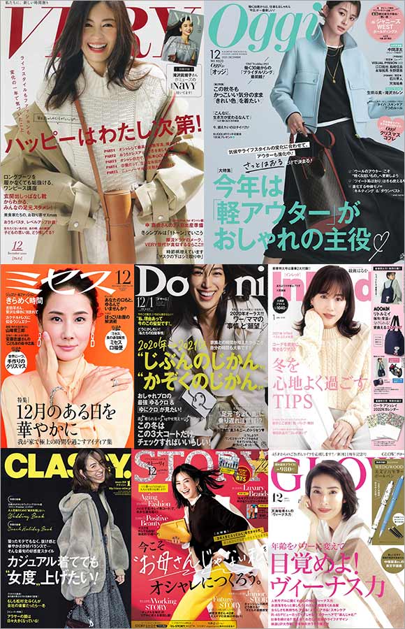 大人のレディースファッション雑誌(VERY、Oggi、ミセス、Domani、STORY、GLOW 他)に掲載されていたダウンブランドを元にしています。