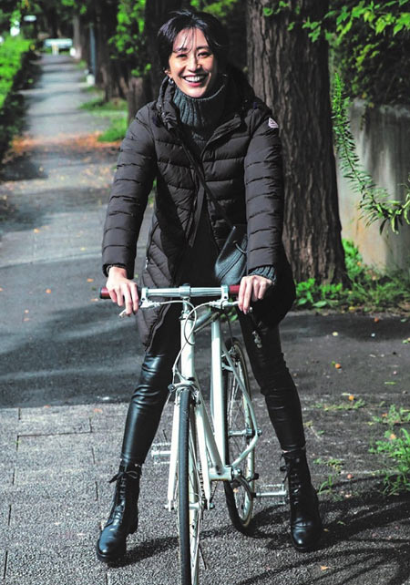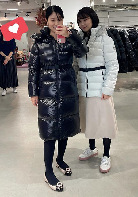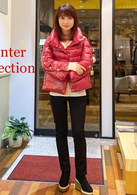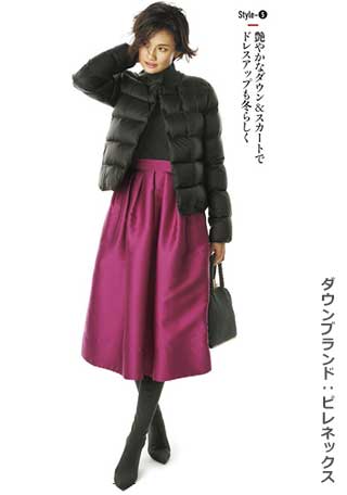 〈左〉女らしく着られる絶妙なパープル! 防寒重視になりがちなダウンこそ、ファッションとして色物を楽しむのが今年の気分です♪ 裾リボン付き。