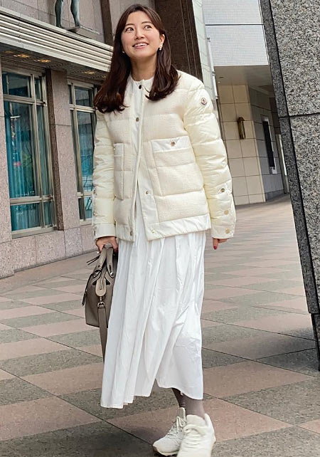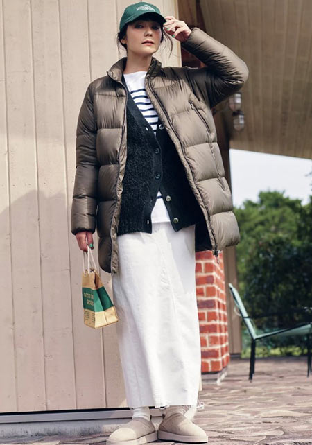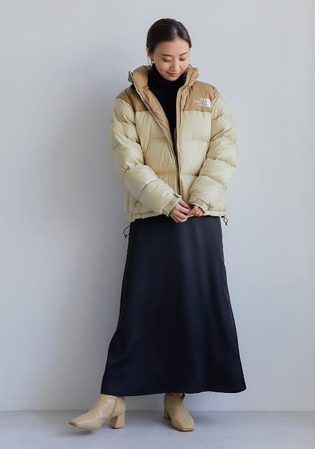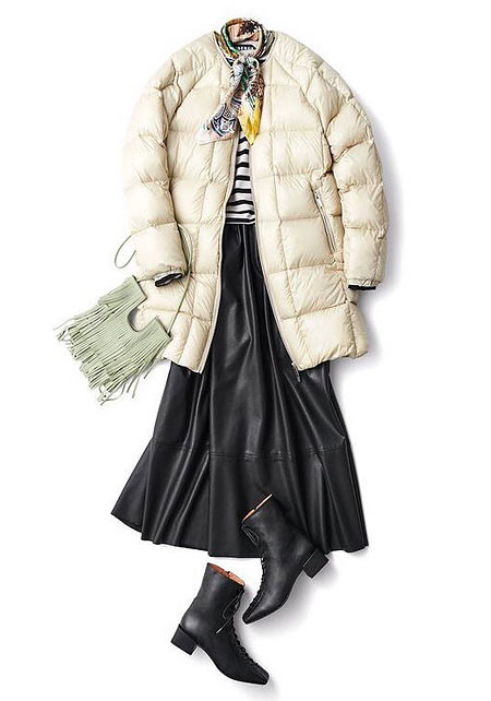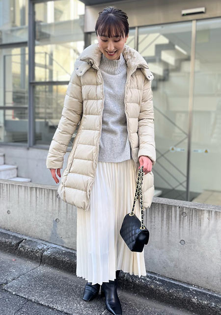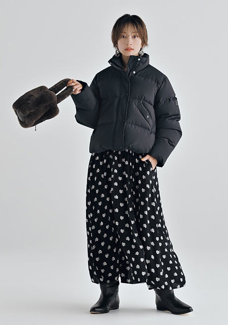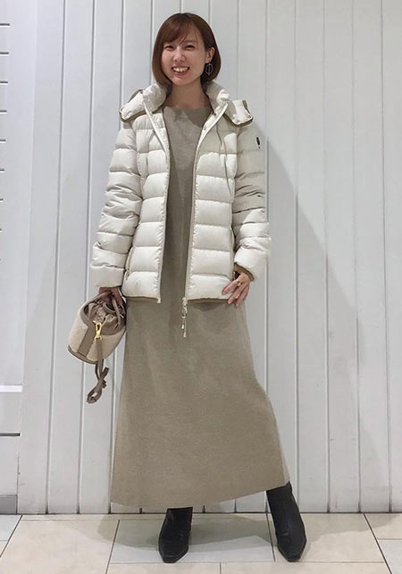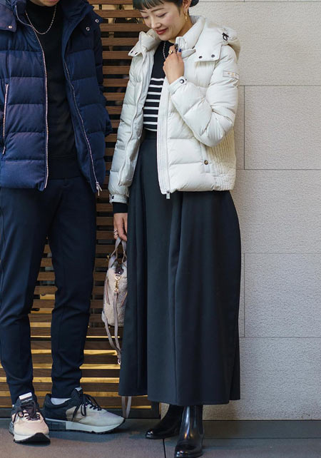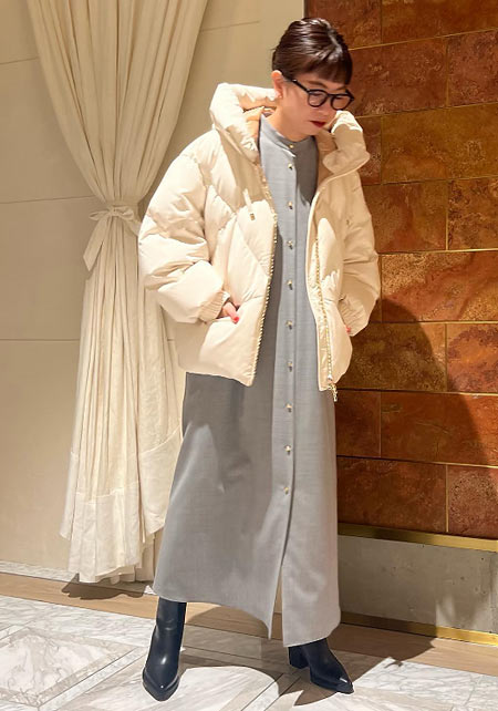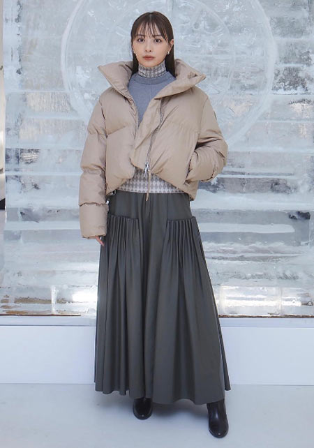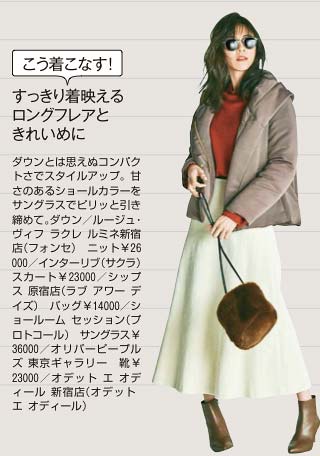 〈右〉今季最大のトレンドはスカートにも合わせやすいショート丈ダウン。今までよりぐっと短い丈が一気に旬な雰囲気にしてくれる。ニュアンスカラーでダウンもフェミニンになれる!