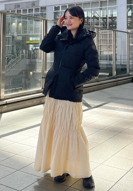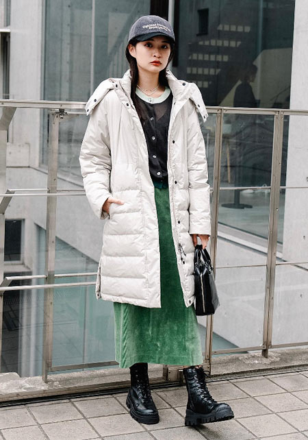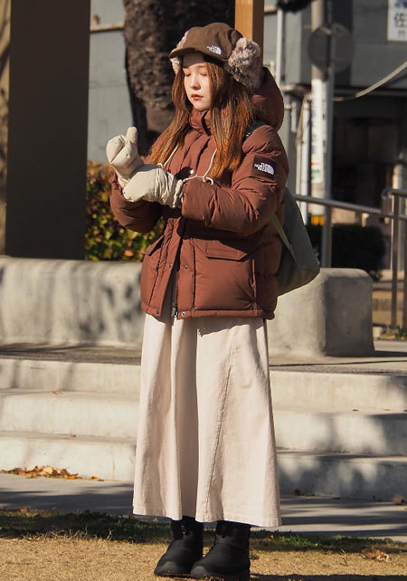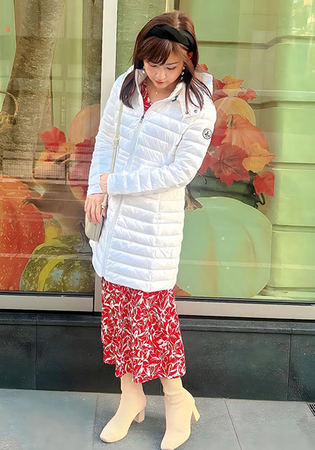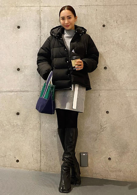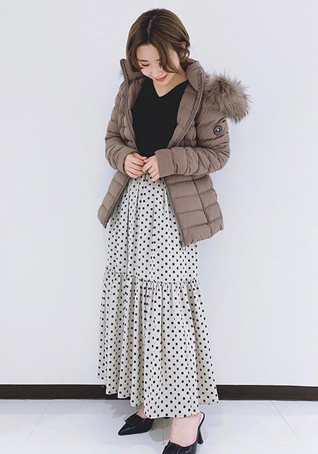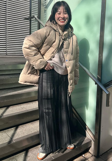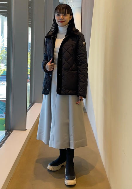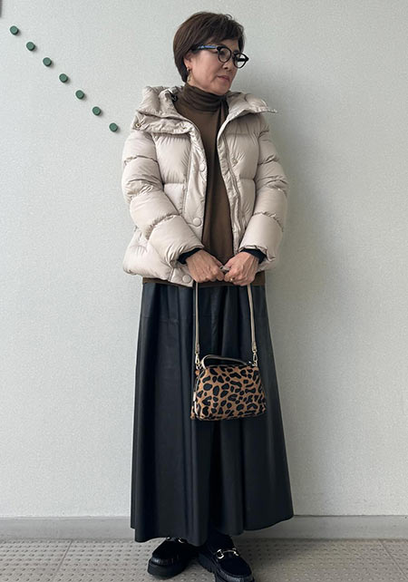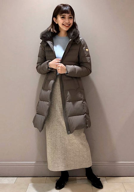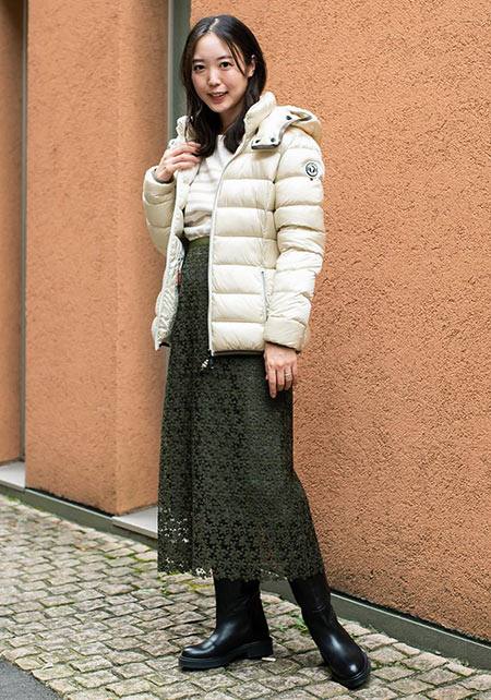〈右〉今季最大のトレンドはスカートにも合わせやすいショート丈ダウン。今までよりぐっと短い丈が一気に旬な雰囲気にしてくれる。ニュアンスカラーでダウンもフェミニンになれる!