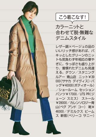 〈下右〉落ち着いた色味で取り入れやすいパープルダウン。地味になりがちな冬のマンネリ化を色の力を借りてブラッシュアップ。衿もとを抜いて着られるオーバーサイズなシルエットが、ラフなデニムスタイルも女っぽく仕上げます。