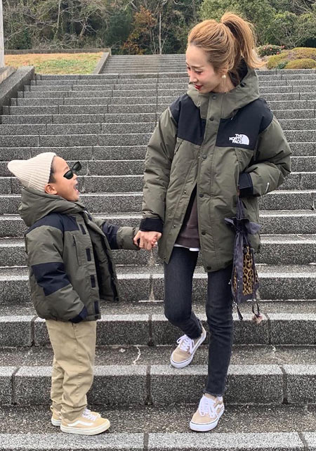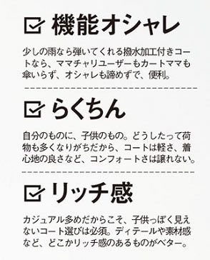 〈下左〉表地はダウン特有の着ぶくれ感なくすっきり羽織れるノーステッチデザイン。さらに細見え、きれいめに着られる上に表生地には撥水加工がほどこされているので、園の送り迎えからアウトドアまでオールマイティに活躍します。