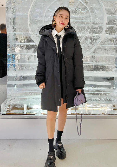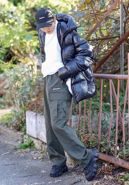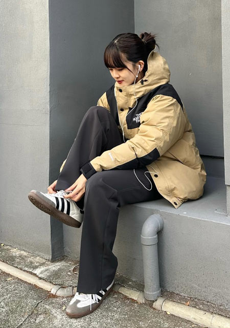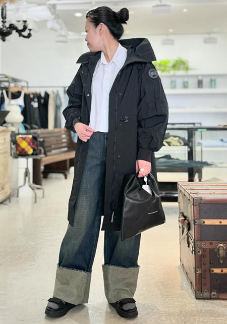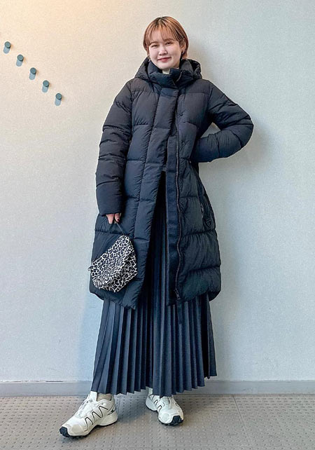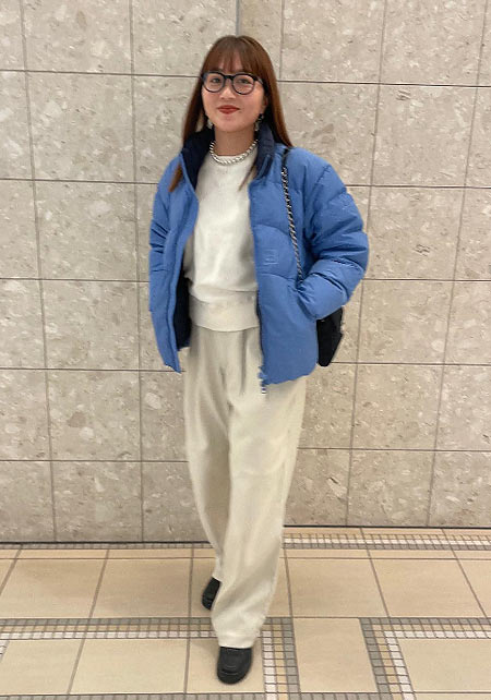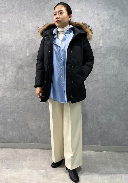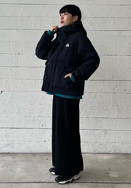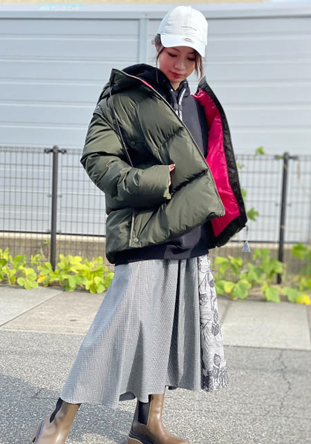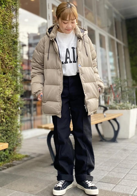 週末カジュアルにぴったりなバイカラーダウンでワンツーコーデもメリハリが。程よいボリューム感で、サイドから見たフォルムもスタイリッシュに決まります。インに着たのは前後差のあるロングスウェット。裾からのぞくくらいがグッドバランス!