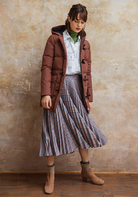 〈上〉スカートにもバランス良く合わせられる絶妙な丈感は、オンオフの幅広いシーンで活躍。ほんのりリッチ感を足してくれるフードの控えめなファーは取り外し可能で表情の変化を楽しめます。