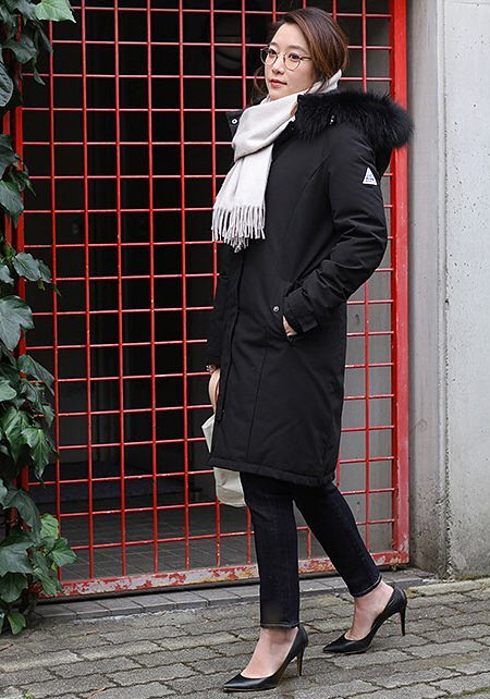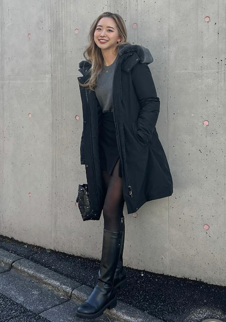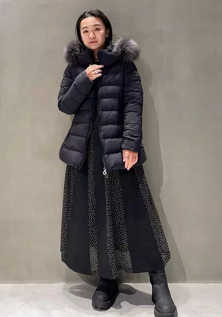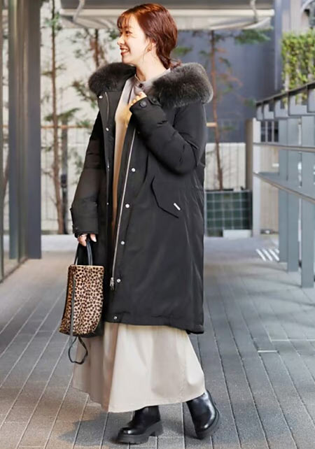 〈右〉ダウンコート特有の胸元や腰まわりの着ぶくれ感を抑えた絶妙なサイズ感がポイント。動きやすいストレッチ素材に加え、ライトに羽織れる軽さも魅力です。ロング丈を感じさせない快適な着心地は、寒い季節のデイリーユースに万能です。取り外し可能なフードはきれいめにも着こなせるラビットファー付き。