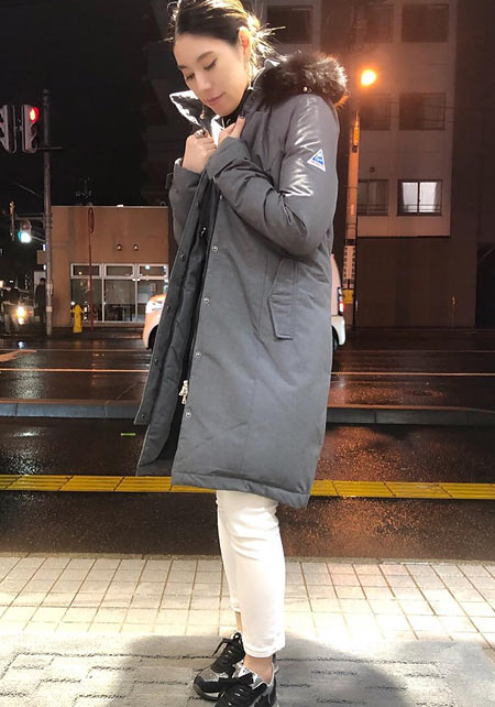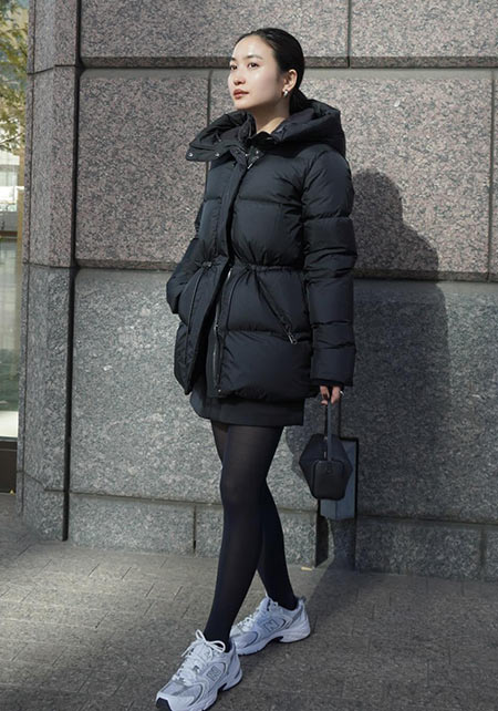 〈左〉カジュアルすぎないのも魅力な一方で、ポリエステル素材だからウールコートよりはアクティブに映えるいい面も。スニーカーと一緒にいつものパンツに合わせるだけで、簡単にアスレンジャースタイルが完成。マット素材&ファー付きなら、フェミニン派もトライしやすい。