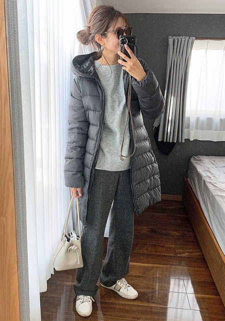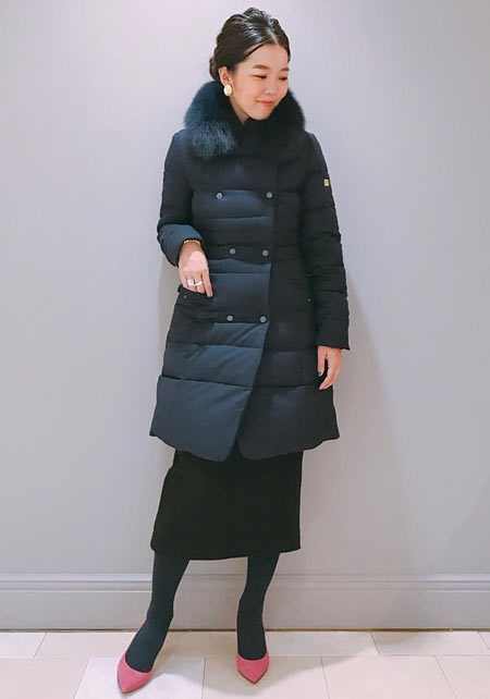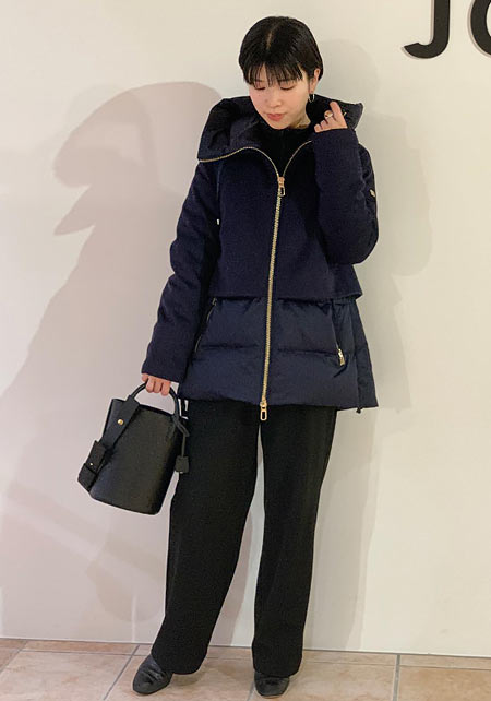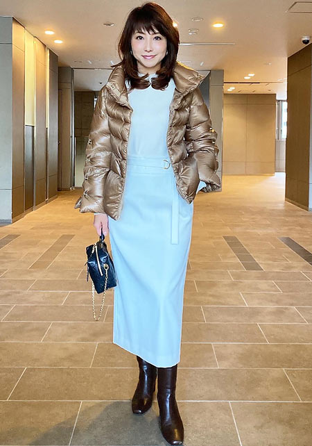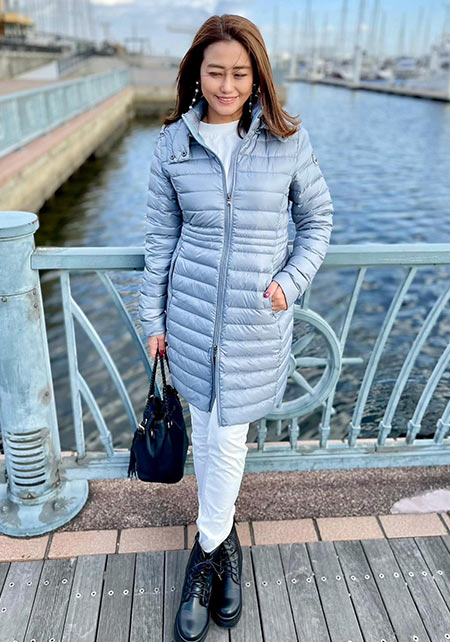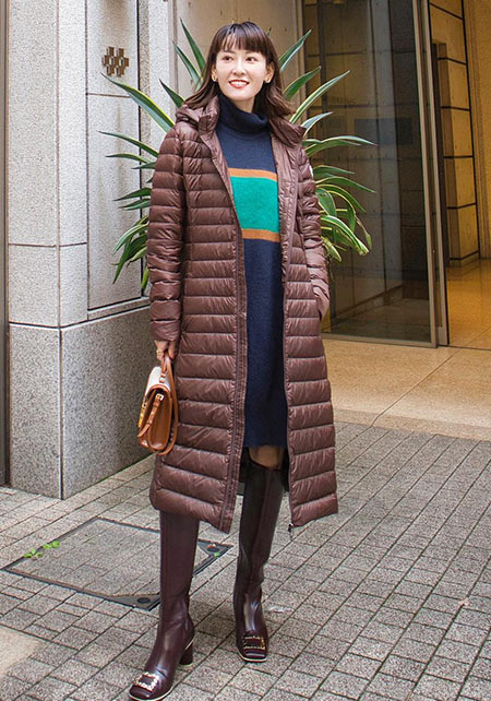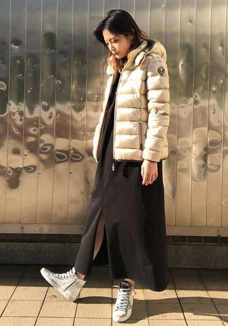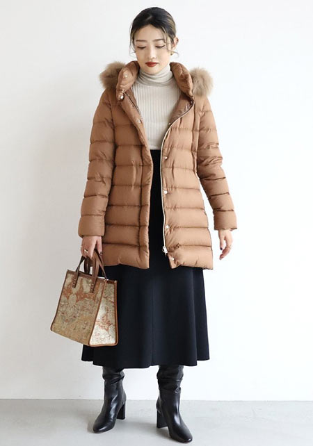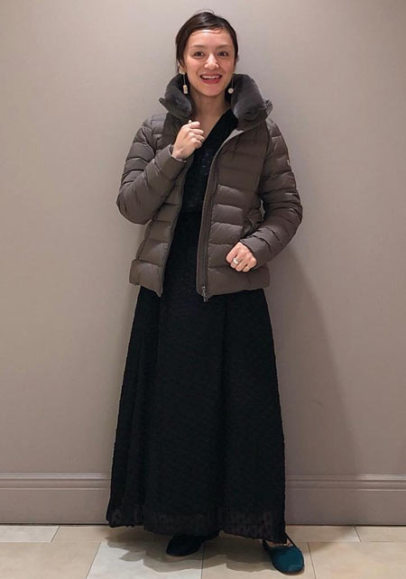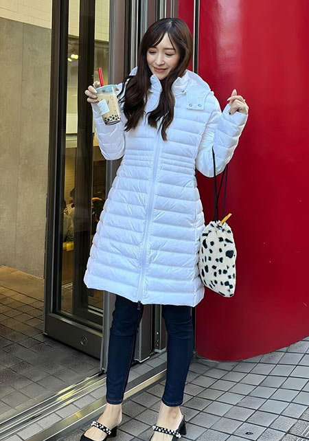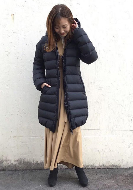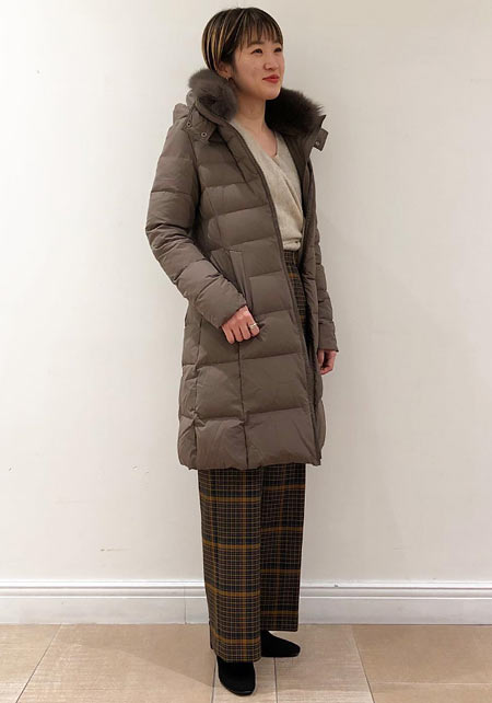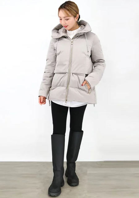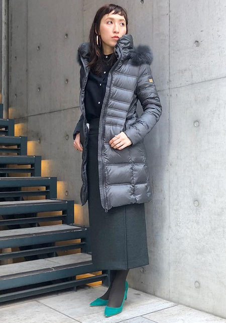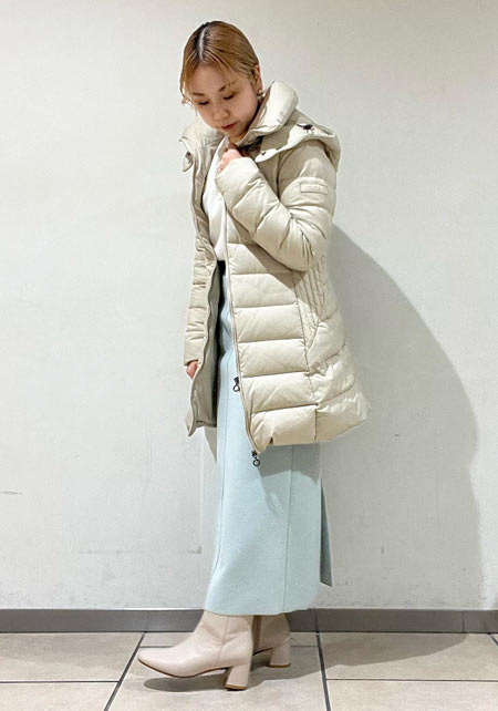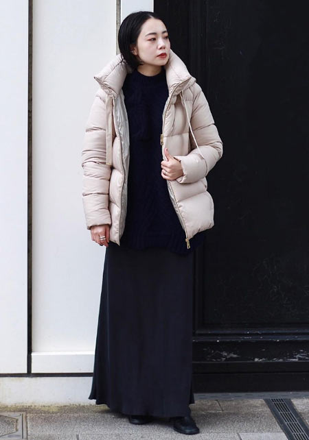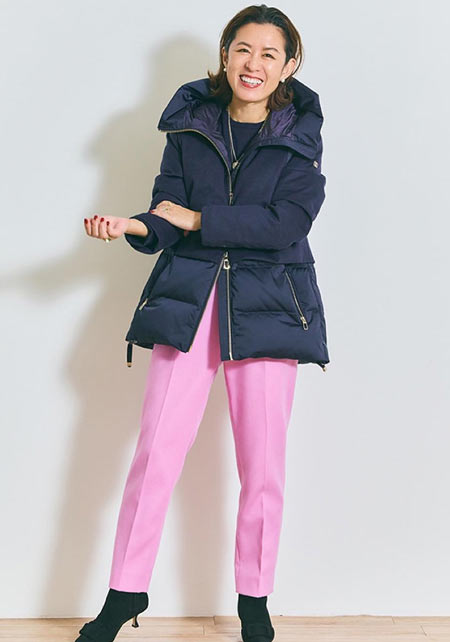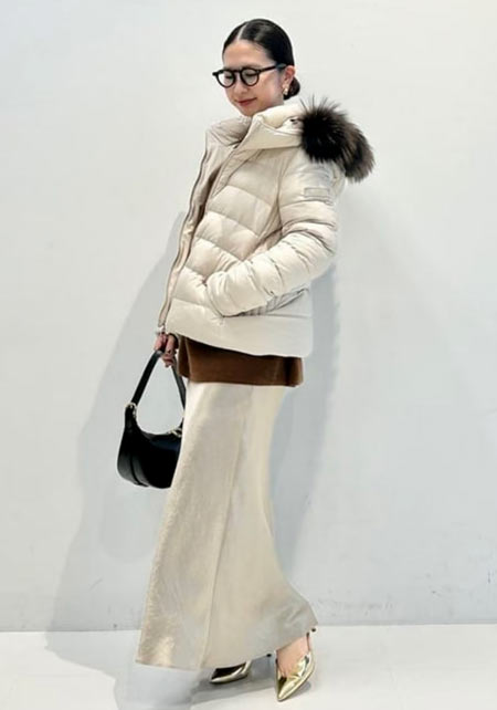 タイトなシルエットが女性らしいダウンコートは、ゴールドジップが冬コーデのスパイスに。