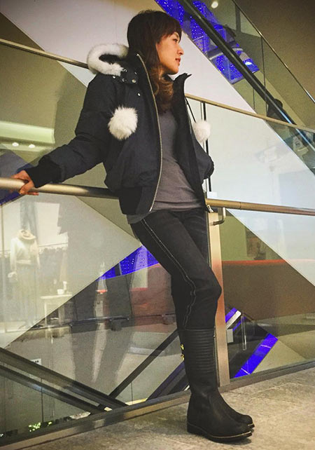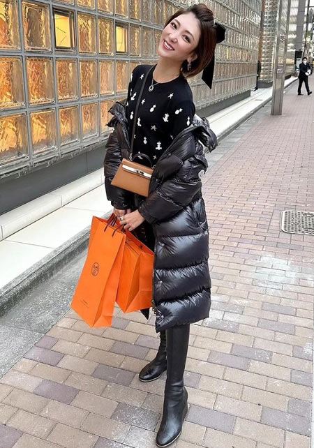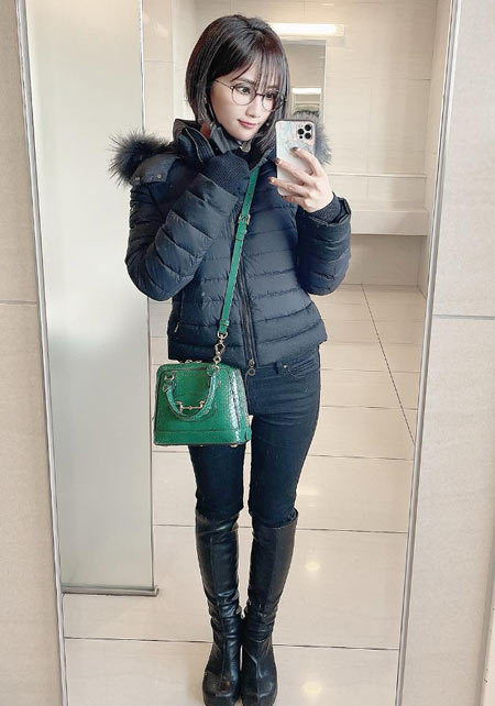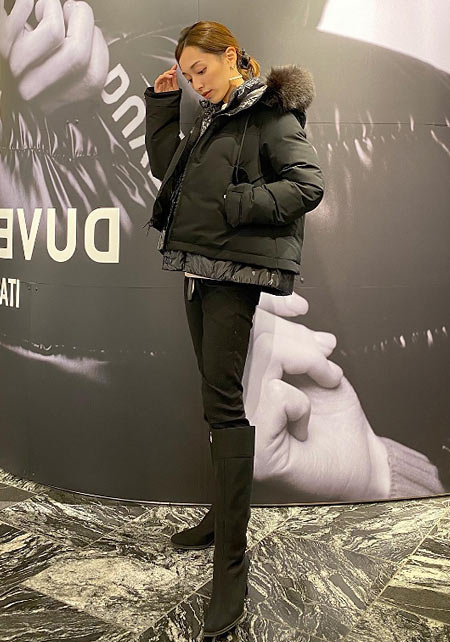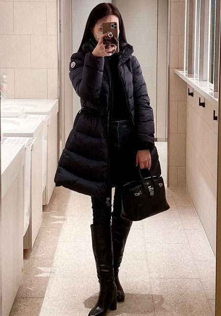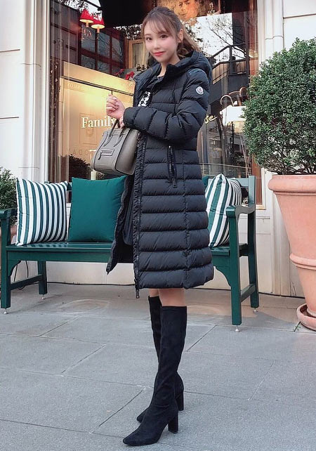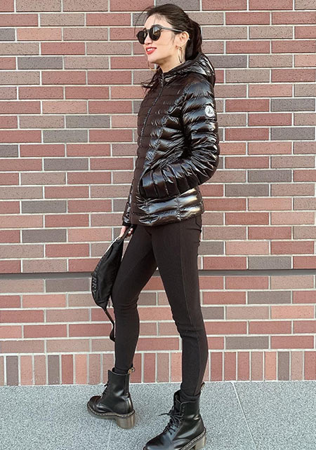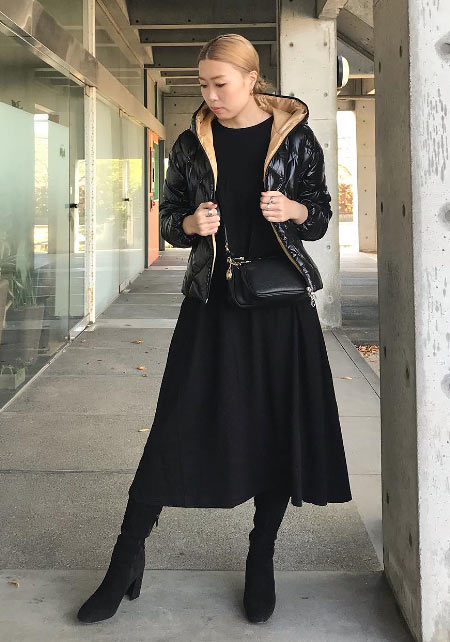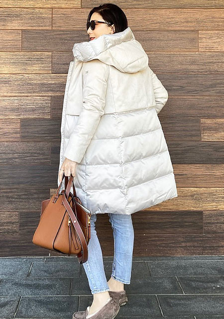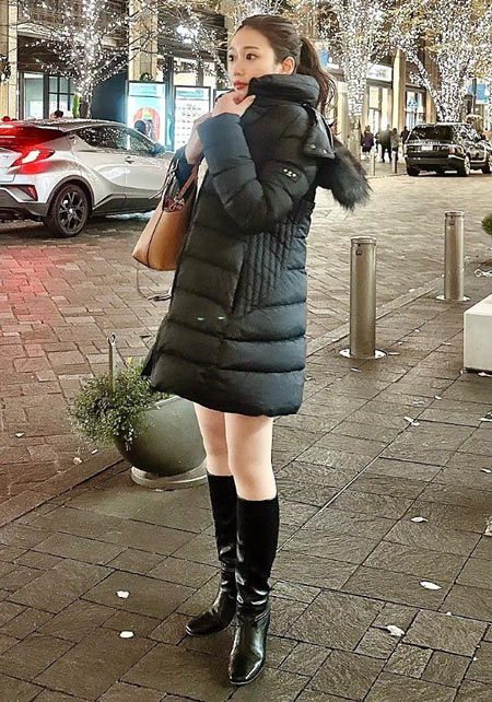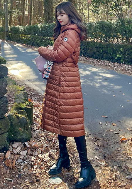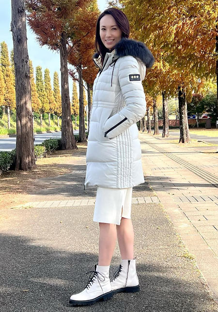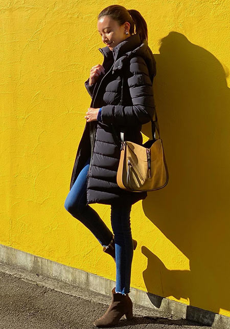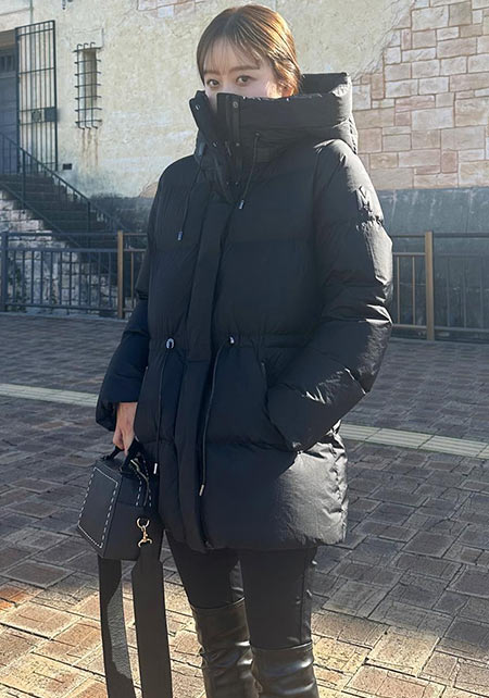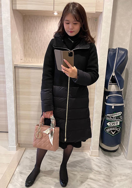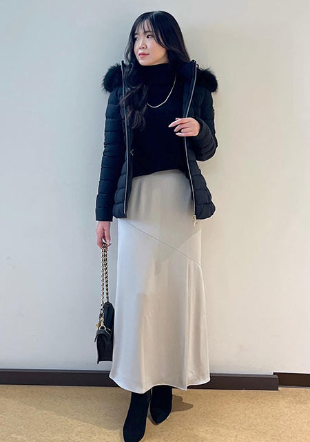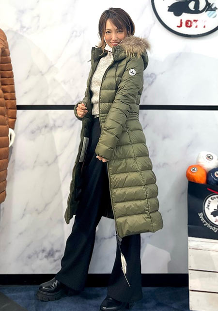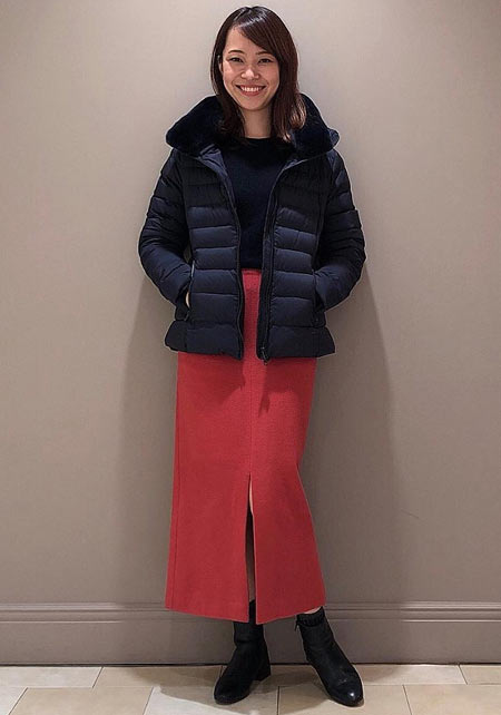 タイトなシルエットが女性らしいダウンコートは、ゴールドジップが冬コーデのスパイスに。