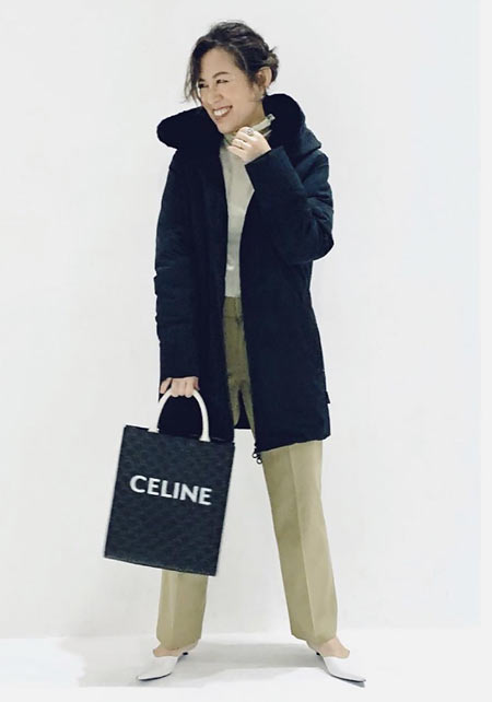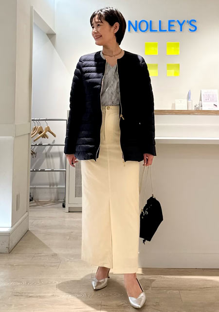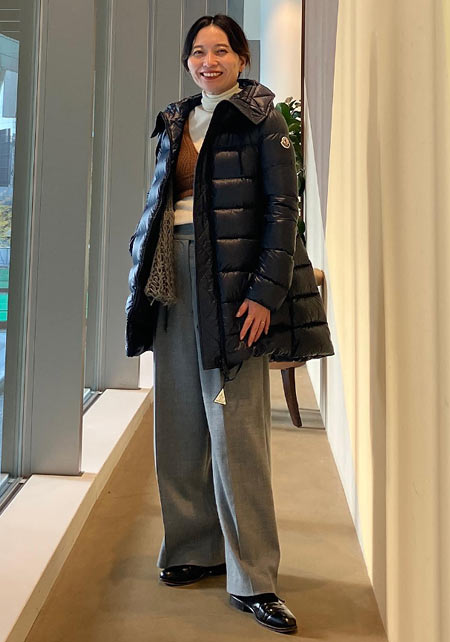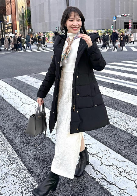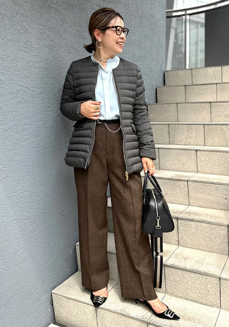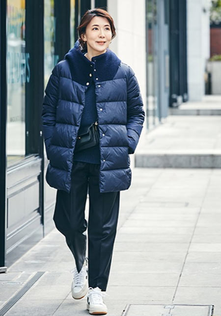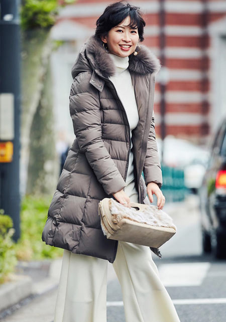 〈右〉表側にステッチのないデザインなら、ダウン特有のカジュアル感が軽減。衿元のファーを外せばより端正に。ウールのノーカラーコート感覚で着られるから、コンサバスタイルにもよりマッチ。お仕事や学校行事などでも重宝間違いなし。