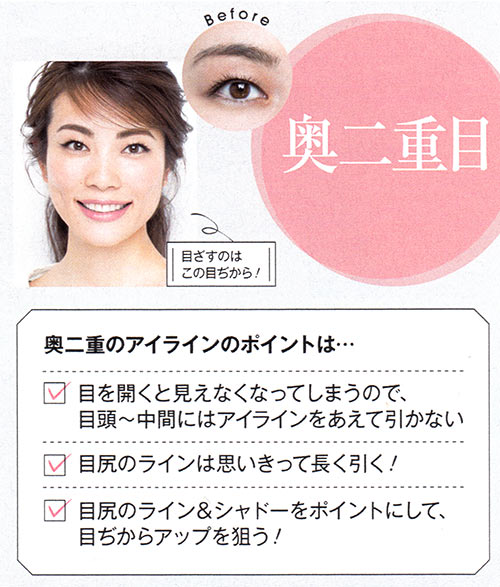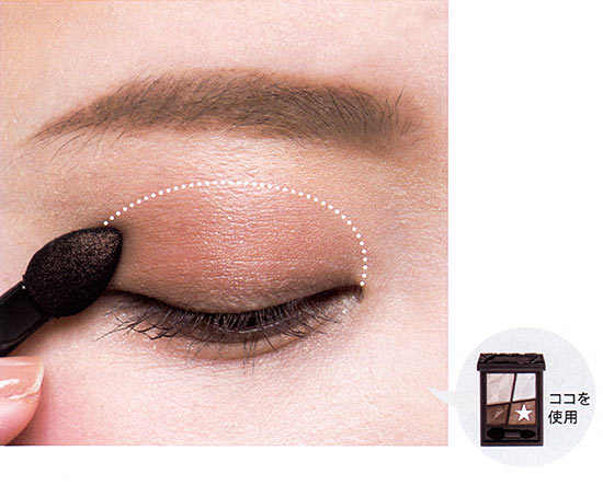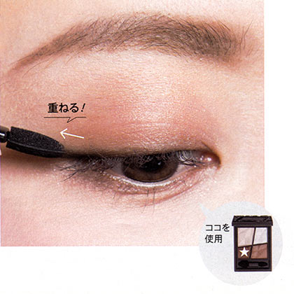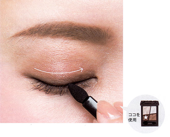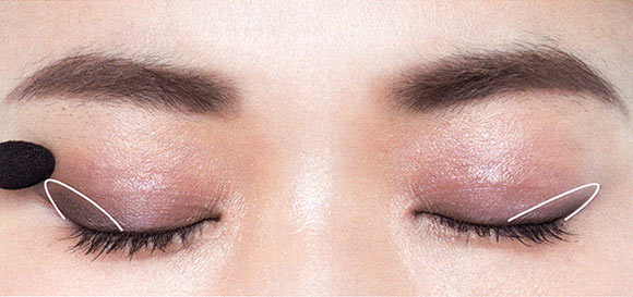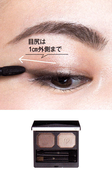 奥二重目をパッチリ見せようと、目の際にガッツリ濃いシャドーを入れたり、ラインを太く描くのは不自然。濃いシャドーは目頭~中間にはせず、黒目の外側~目尻の1cm外側までにオン。