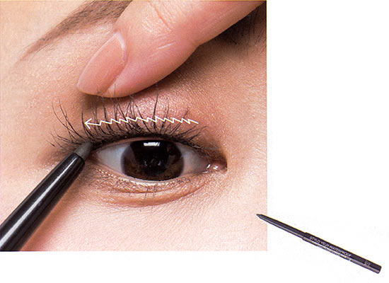 より自然に目ぢからを上げたいので、まつげの上側ではな<“生え際〟を埋める気持ちでラインを。まぶたを軽く持ち上げながら目頭から目尻へ、左右に小刻みにペンシルの芯先を動かし描いていって。