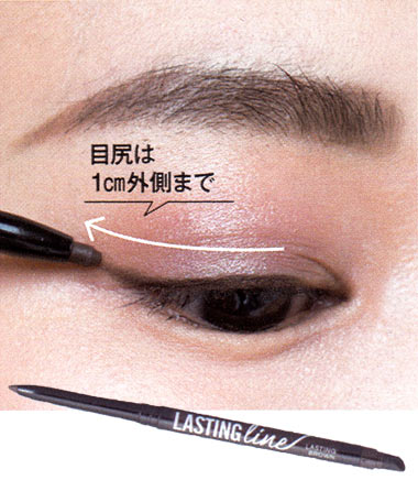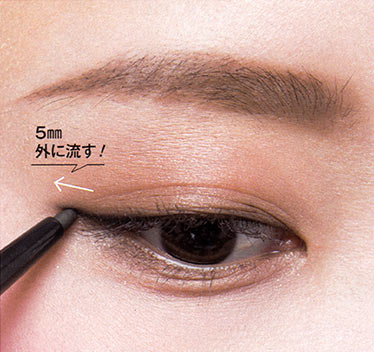 まつげ際を埋めた後に、目尻のみには“まつげの上側にラインをプラス。黒目の外側から目尻に向かって、目尻は5mmほど外側に流すように引いで“目幅〟を出し、自然な目ぢからアップを狙って。