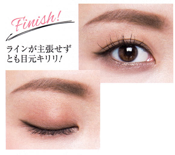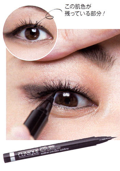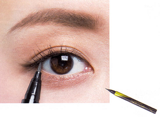 まつげの内側のうっすら肌色が残っている部分を、リキッドアイライナーで埋めて。基本の二重目の入れ方と異なり、まつげの隙間をペンシルで埋めていないので、このひと手間が奥二重の自然な目ぢからアップにマスト!