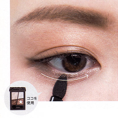 キツく見えがちなキレ長目の場合は、下まぶたにもダークブラウンのシャドー(右下)を。下まぶた際の中央から目尻に向かって、目尻は1で入れたシャドーと重なるくらいまでぼかしてカゲをつくることで、優しげなタレ目風に。